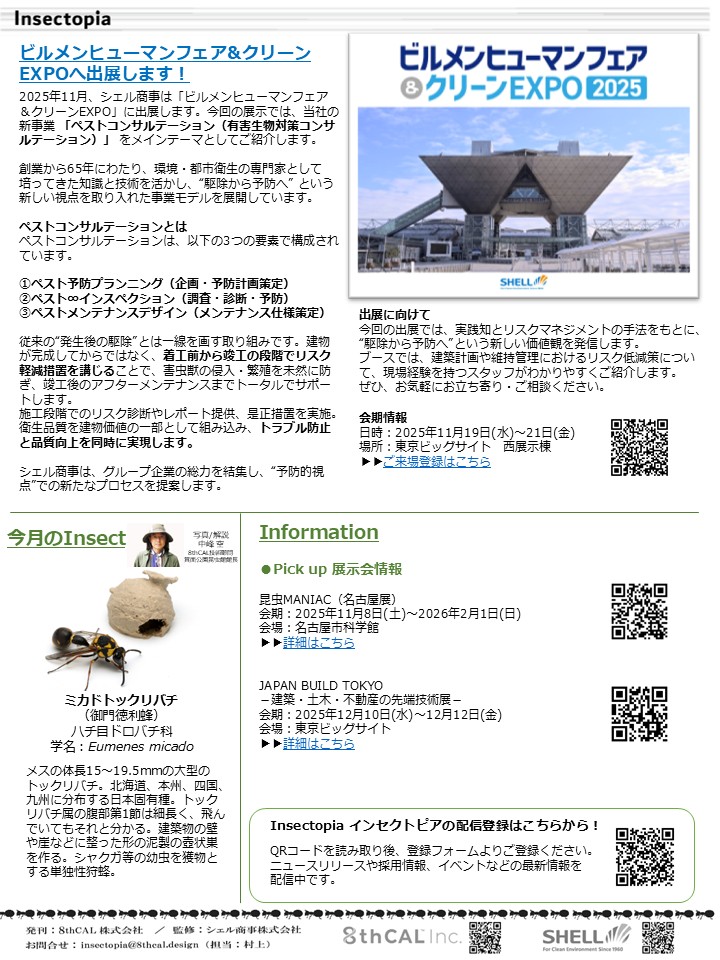 ニュースレター Insectopia(インセクトピア) vol.31を発行いたしました。 今月号の特集 ◆マダニが媒介する感染症「SFTS」に要注意! ◆ビルメンヒューマンフェア&クリーンEXPOへ出展します! ぜひご覧ください。
